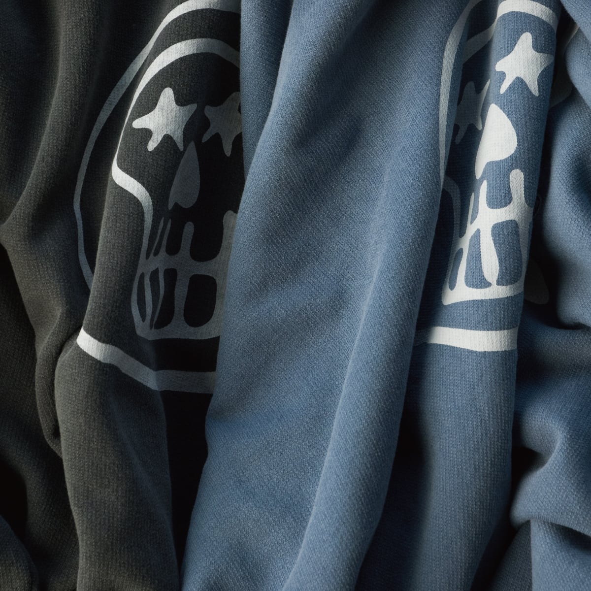フロントにはスカルロゴを生地に染み込ませる方法でプリント。表情にとても馴染みました。