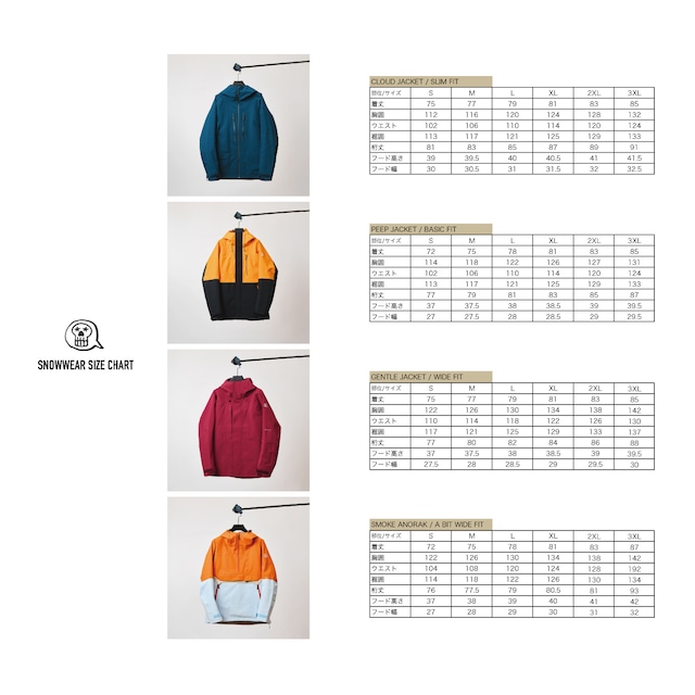 <ご予約商品> 予約期間 2026年1月15日〜2月22日 商品お届け予定 2026年10月中旬〜下旬 *商品写真は端末により実物のカラーと見え方が変わる場合がございます。 *掲載写真とは一部仕様が異なる場合がございます unfudge snow wear model / SMOKE ANORAK size / S : M : L : XL : 2XL : 3XL FABRIC : TOREY 3LAYER : 耐水圧20000mm 透湿性10000g/m2 24h 日本人男性の平均体型「身長171cm・体重67kg」の方を「L」基準としサイジングしております。女性では「身長158cm・体重50kg」を基準に「S」をサイジングしております。 アンファッジスノーウェアの中でも最もポップな「スモークアノラック」です。 アノラックという歴史ある形にunfudgeがオリジナルシルエットと機能を合わせ作り上げました。 ・アームや首回りなど随所に立体裁断を採用し激しい動きにも追従するデザイン。 ・バックカントリーではザックを背負いやすいよう脇下を絞り込んでいます。同時にこのシルエットは腕が長く見えることでスタイリッシュな印象を与えます。 ・肩口には一切のステッチを施していません。上空から降ってくる雪や雨に当たる部分には可能な限り縫い目を施さず万が一の侵入を防ぎます。 ゲレンデから山岳まであらゆるシチュエーションで使用できるスノーウェアです。プロスタッフやフィールドスタッフはこれまで世界中のスキー場や山岳で滑ってきました。彼らが考える一番重要な要素。それは、 「遊びに集中できる物」すなわち「最上級の遊び道具」である事です。 厳しい環境に適応するためだけではなく、普段のファンライディングでもストレスを感じない気の利いた機能をも盛り込んで作られています。 高機能+ポップなカラーもunfudgeが持つ特徴の一つです。非日常を味わうゲレンデです。せっかくの時間を楽しく過ごすためにはこのポップなカラーが欠かせません。 様々な機能がある事で、あなたのウィンターライフをより快適で楽しい時間へとかえてくれます。